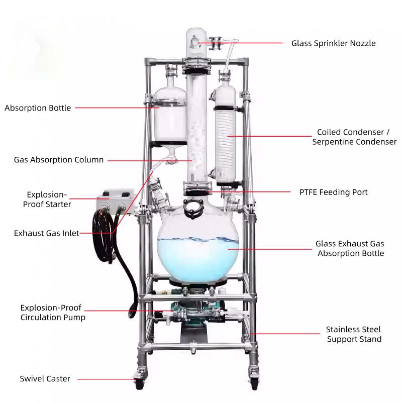 The ERL Gas Scrubber uses a circulation pump to move the absorption liquid from a round-bottom flask through a condenser into a spray nozzle. The liquid sprays from the top of the absorption tower, passing through the packing material and returning to the absorption tank. This ensures thorough gas-liquid contact, allowing the laboratory gas scrubber to efficiently capture harmful gases and aerosols.