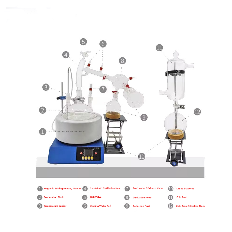 The Molecular Distillation system includes an electric heating mantle with heating power ranging from 200W to 650W for small volumes, and up to 3000W for 20L capacity, with stirring power of 40W. Stirring speeds are adjustable from 50 to 1800 r/min, and the temperature range extends from room temperature to 380°C to ensure optimal Molecular Distillation. Three-neck distillation flasks with 24/39 joints are included in capacities from 500ml to 5000ml. Temperature sleeves, short-neck distillation heads, short-neck ball joints, and glass vapor/air baths are included for reliable Molecular Distillation operation. Collection bottles of 100ml, 250ml, 500ml, 1000ml, and 2000ml are provided for efficient recovery during Molecular Distillation. The system also features detachable connectors, plastic clamps, a lifting platform, support/motor rings, finger clamps, and a cold trap to protect the vacuum pump during Molecular Distillation. Optional equipment includes a low-temperature device (-120°C to RT) and a circulating water vacuum pump to enhance Molecular Distillation performance.